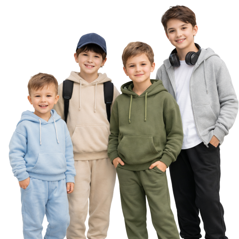 الطقم مكوّن من سويت شيرت بقبعة وبنطلون مريح، مناسب للمدرسة والخروج ويوفّر حرية حركة كاملة للأطفال.